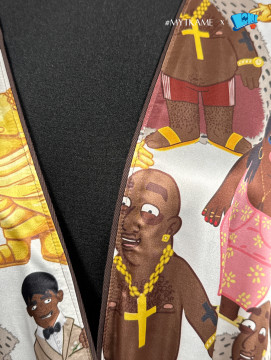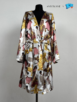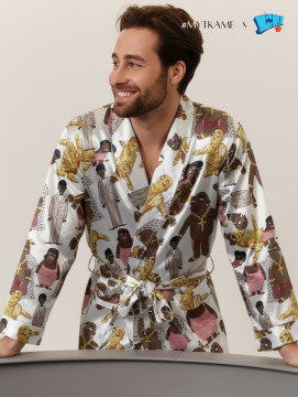 Luxusný saténový župan s ikonickými postavami Pištu Lakatoša a Obliny. Ľahký, príjemný na tele.